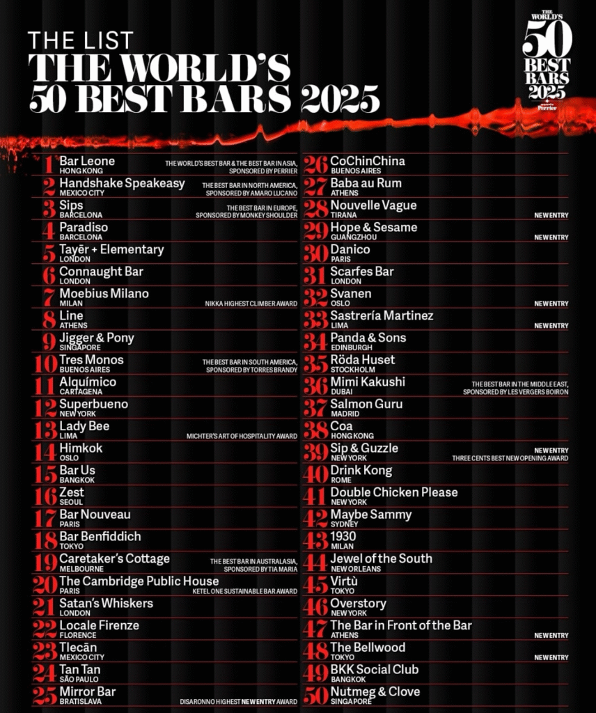 La classifica The World’s 50 Best Bars 2025 è l’edizione più recente dell’annuale ranking internazionale che celebra i migliori bar del mondo, scelti da una giuria di esperti del settore. La cerimonia ufficiale si è tenuta l’8 ottobre 2025 a Hong Kong, presso il terminal crocieristico Kai Tak, con una serie di eventi collaterali durante tutta la settimana. Rispetto alle precedenti edizioni, il 2025 ha confermato tendenze consolidate ma ha anche riservato alcune sorprese: il leader del 2024 non è stato riconfermato e si registrano ingressi nuovi e scalate importanti nella classifica. (Ad esempio, Moebius Milano ha guadagnato ben 31 posti, ottenendo il premio “Highest Climber”.) A proposito di italiani, con la giusta dose di campanilismo, ecco qualche info sui nostri, presenti nella top 50.