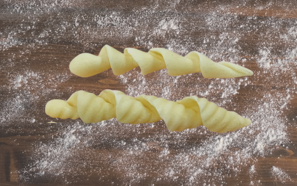 I cicatelli appartengono alla tradizione molisana e a quella pugliese del Gargano, due aree in cui la pasta di semola lavorata a mano viene ancora preparata spesso in casa. L’impasto si ottiene con semola rimacinata, acqua e sale, senza aggiunte particolari. La consistenza deve essere elastica, perché la modellatura richiede una lavorazione rapida: dalla sfoglia ricavata si tagliano piccoli cilindri che vengono trascinati con due o tre dita sulla spianatoia per ottenere una forma allungata con una conca centrale. Questo incavo nasce dalla pressione delle dita e definisce la capacità del formato di trattenere i condimenti più densi.