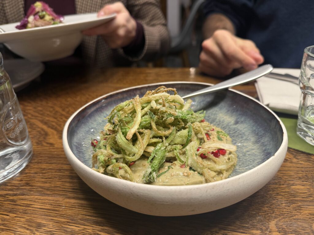 Molto riusciti anche i fusilloni con salsiccia, zucca, finferli e ‘nduja: un piatto che ha carattere, perfetto per chi ama il piccante ma senza mai perdere delicatezza. I sapori si bilanciano bene tra loro, con la zucca che arrotonda e la ‘nduja che dà la spinta ideale senza sovrastare. Chiudiamo poi con la pasta cacio, pepe, cruschi e carciofi fritti: una rivisitazione di un grande classico romano che funziona alla perfezione. Cremosa, saporita, con i cruschi a dare croccantezza e i carciofi fritti a completarla in maniera elegante e piacevole.