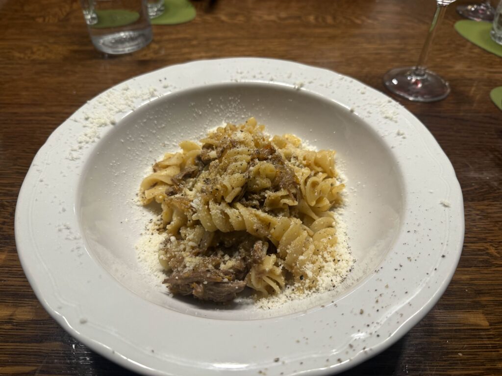 La cena è proseguita con una selezione di primi decisamente all’altezza dell’ottimo avvio. Il piatto che ha messo tutti d’accordo sono stati i pici alla genovese: una versione sorprendente, intensa e piena, che non esito a definire la migliore genovese che abbia provato a Roma. Cottura della pasta perfetta, sugo ricco ma mai pesante, un equilibrio di sapori che rimane impresso.